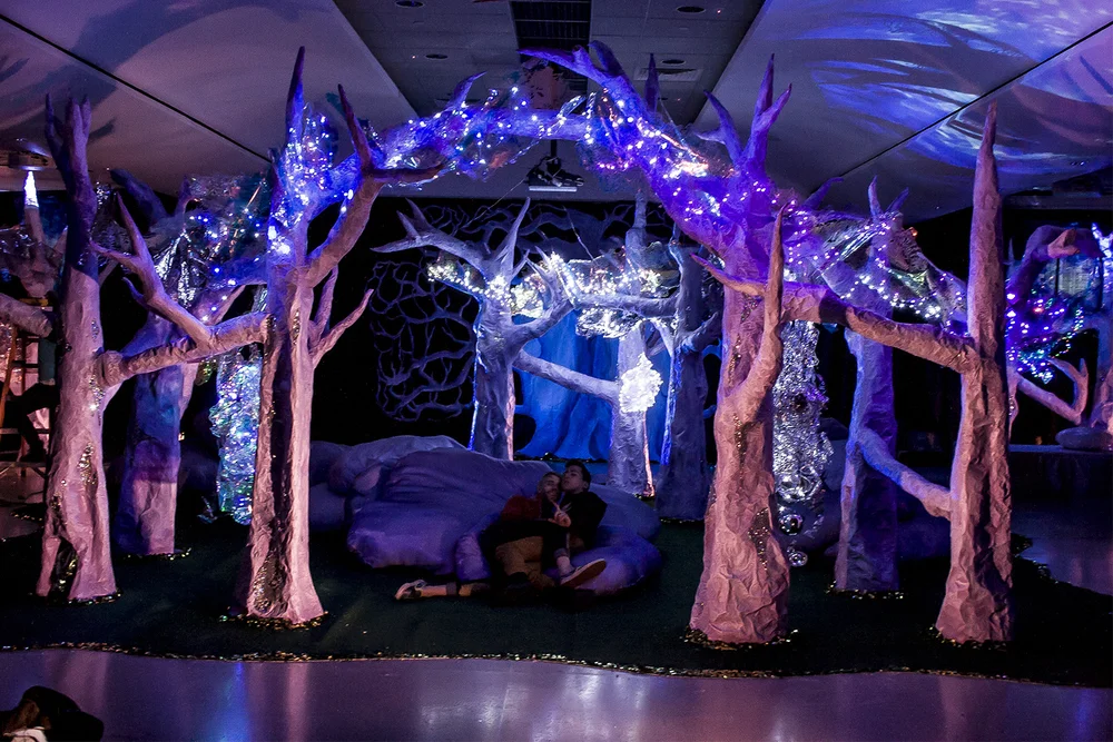 Interactive installation for Gawker Media’s 2014 holiday party. The space was made to look like a futuristic snow forest. The all white space featured an abstract tree sculpture with branches reaching in every direction. White fringe panels hang off the branches with projections of falling jewels in kaleidoscope patters. Later in the night the walls split and red balloons spill out piercing the all white space revealing a hidden red room.